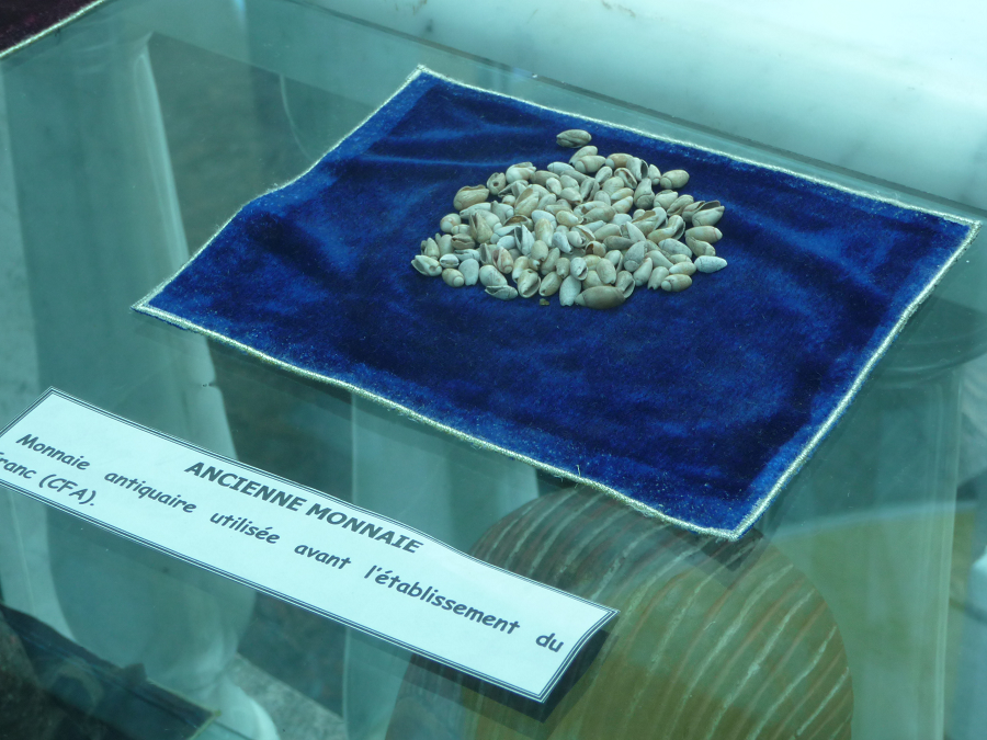 On display in the National Museum of Congo in Brazzaville: “Ancient Money.” I took the picture because this is the money that made us human 90,000 years ago. They are tiny Nassarius gibbosulus estuarine snail shells too small for food, perforated with small holes to string on a necklace, used as money “before the establishment of the CFA” as the sign says, the Central Africa Franc in 1945.
