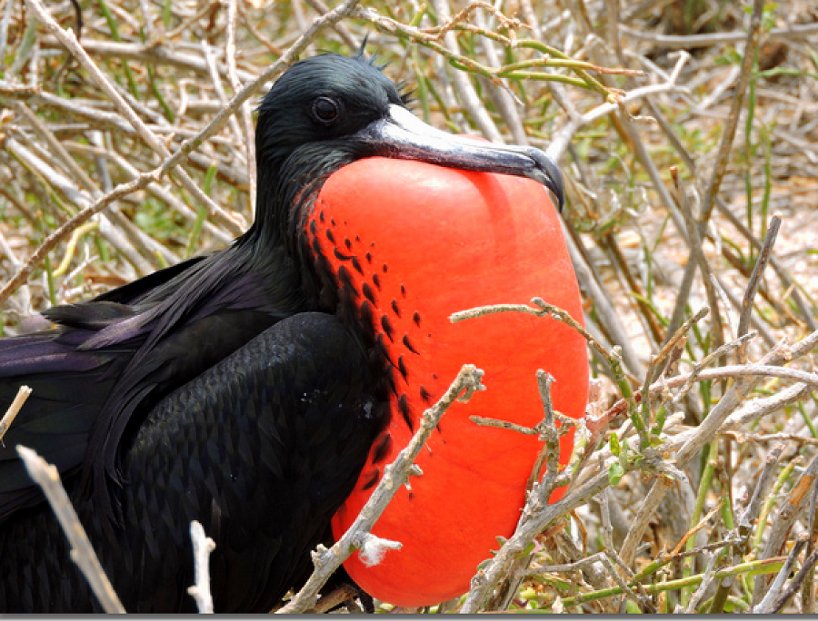 frigatebirdThe male Magnificent Frigatebird has a flap of loose bright red skin on his neck called a “gular sac.” During mating season, they huff and puff, filling it with air to blow it up like a balloon. They then parade around showing off for the ladies, for the bigger the red balloon, the more the ladies are aroused. Size matters, even in the Galapagos.