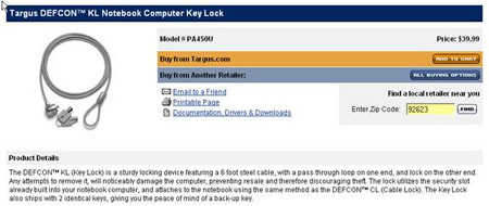 However, products like the Targus DEFCON KL Notebook Computer Key Lock feature a six-foot steel cable with a pass-through loop on one end and a lock on the other. You have a choice of a key lock or a combination lock.