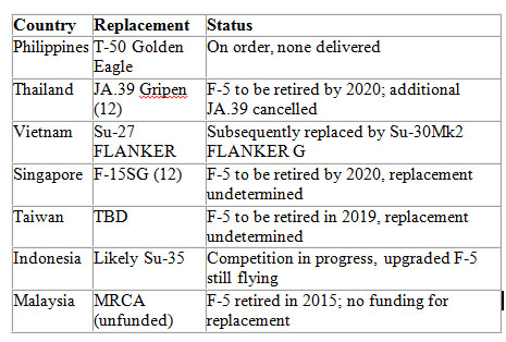 This is an acute problem in Southeast Asia, as U.S.-built combat aircraft have reached the end of their service lives. The last U.S. export fighter, the F-5E Tiger II, has so far been replaced by non-U.S. fighters, forfeiting a major security cooperation opportunity. The last remaining F-5s in Southeast Asia will retire in the next five years with no American replacement options except the much more expensive F-16, F-18 and F-15E.