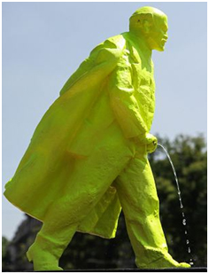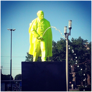 The statue’s creators, led by artist Bartosz Szydlowski, painted it in radioactive yellow-green, and entitled it “The Fountain of the Future.” It’s a fountain, you see, depicting Lenin relieving himself.