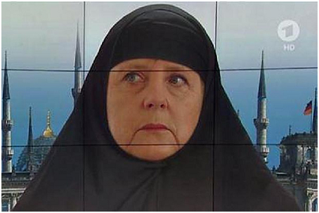 This satirical portrayal of Angela Merkel as “Moslem Merkel” with the Reichstag surrounded by minarets has got the panties of every German libweenie in a twist. It was shown on ARD television to scandalize masochistic Germans welcoming the Moslem invasion of their country created by Merkel, and it succeeded.