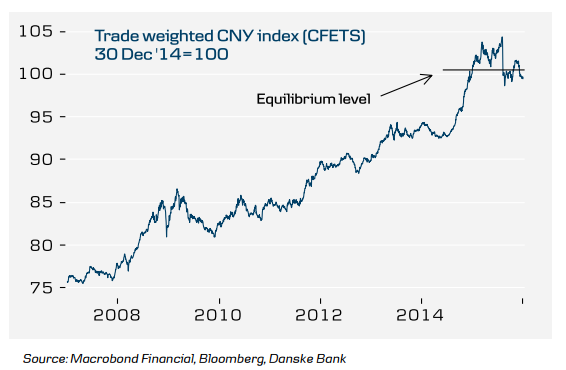 Last month’s switch to the currency basket (CFETS) was a belated move to liberate China from the rising dollar as the US Federal Reserve tightens policy. The view in Beijing is that the yuan is now fairly valued after soaring since mid-2012.