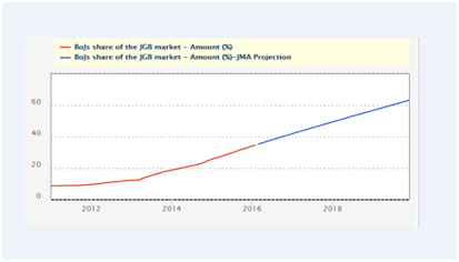 The central bank owned 34.5% of the Japanese government bond market as of February, and this is expected to reach 50% by 2017.