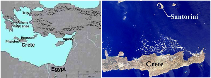 Note in the map above the Minoan island of Santorini about 60 miles north of Crete.  Sometime between 1500 and 1450 BC, the island – known to the Greeks as Thera – suffered a colossal volcanic explosion 10 times larger than Krakatoa in 1883 that was heard 3,000 miles away.  The resultant mega-tsunami wiped the Minoans out on Crete.  It was “The wave that destroyed Atlantis.”