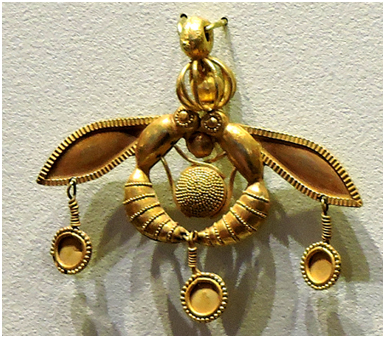 The best example of that skill is the famous Minoan Bee Pendant dated to 1800 BC, depicting two bees carrying a drop of honey to their honeycomb:
