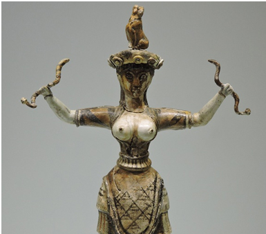 Minoans worshipped female deities, such as the famous “Snake Goddess” holding snakes as the symbol of fertility: