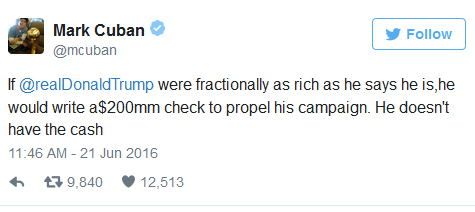 “If Donald Trump were fractionally as rich as he says he is, he would write a $200 million check to propel his campaign,” tweeted Mark Cuban,.  “He doesn’t have the cash.”