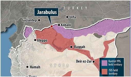 Turkey’s president Erdogan stated publicly that sending his military into Syria was a direct response to the ISIS suicide bombing of a wedding in Gaziantep in southeastern Turkey on Saturday (8/20), resulting in 54 killed and scores wounded.  He hailed his forces for capturing the “Islamic State stronghold” of Jarabulus in Syria on the border with Turkey.