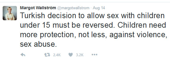 Last week Monday (8/15), Sweden’s Foreign Minister tweeted her outrage at the Turkish constitutional court’s July decision to abolish part of the country’s criminal code that classifies sexual acts with children under 15 as “sexual abuse”: