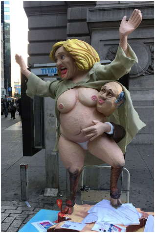Here’s what most people think of her.  On Tuesday morning (10/18), this sculpture of a hoofed and naked Demon Hillary with a Wall Street banker wrapped around her appeared in downtown Manhattan.  The artist is unknown – but I hope we see more of his work.
