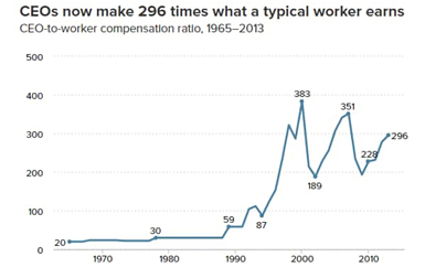 The World Economic Forum – or simply WEF – itself publishes the figures that tell us why American democracy has gone into seizure. In 1965 the average chief executive of an S&P 500 company earned 20 times as much as their workers. The ratio was still 30 times as recently as 1988.