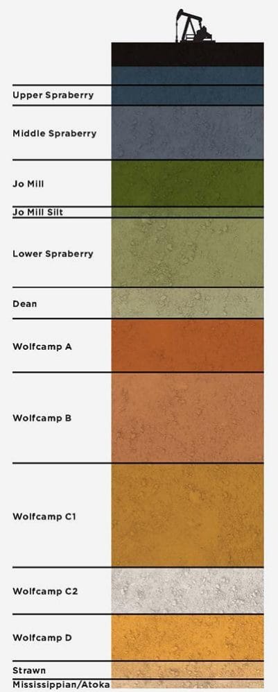 The beauty of the Permian rock is that it has up to twelve layers “stacked” on top of each other down to a depth of 12,000 ft, offering multiple seams and perfectly suited to horizontal drilling.