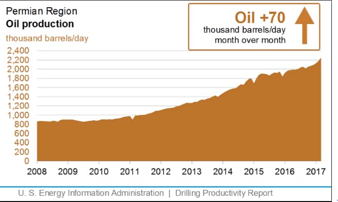 “The Permian never stopped growing and now it is going to add 300,000 to 500,000 (b/d) a year. As long crude prices are around $50 to $55, we’re in the sweet spot. The rig count is going to take off,” he told yours truly.