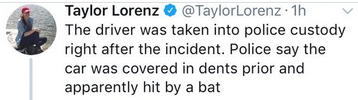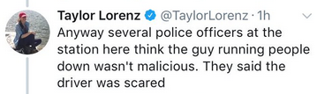 A 20 year-old white guy with a history of mental problems, James Fields, drove into a crowd, killing Heather Heyer, 32, injuring many.  Reporter Taylor Lorenz was an eyewitness.  She tweeted:
