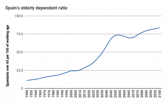 This is an existential crisis for the Spanish state. Spain is at the cusp of a steep rise in the proportion of elderly dependents (from 25% of the economically active population to an insupportable 50% by 2050).
