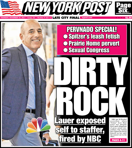 This is yesterday’s (11/30) NY Post cover – note the strategically placed NBC, ah, peacock.  Matt Lauer is the latest libtard harasser in an amazingly long list of media and entertainment pervert celebs, almost everyone a leftie.  Trump gloated: