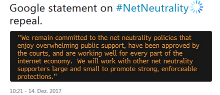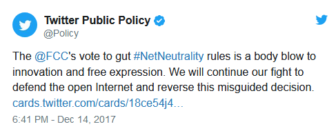 Facebook Chief Operating Officer Sheryl Sandberg:  “Today’s decision from the Federal Communications Commission to end net neutrality is disappointing and harmful.”