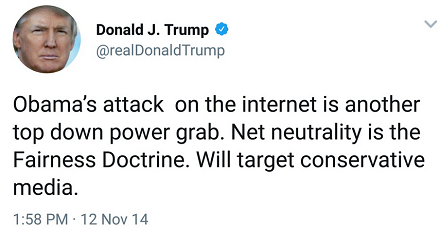 trump-tweet-111214The entire Net Neutrality frenzy is a very teachable moment on how whatever lefties want it’s always more government control, and whatever they say it’s always the opposite of the truth.  It’s also a frightening lesson in their ability to whip up a demonic frenzy against freedom among unthinking sheeple.