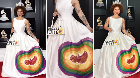 Time for an Ode to Joy!  No, not Beethoven’s 9th, but to actress-singer Joy Villa who was the star of the Red Carpet at the otherwise forgettable Grammy Awards on Sunday (1/28) with her Pro-Life dress: