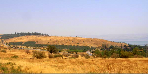 The trees on the hilltop are where Jesus delivered the Sermon on the Mount.  At the base of the hill on the right is Bethsaida of Galilee (called today by the Arabic name of Tagbha) where Jesus performed the miracle of loaves and fishes.  Next to Tagbha (on the back side of the hill) is the fishing village of Capernaum to where Jesus moved from Nazareth to begin his ministry, and home of the apostles Peter, James, John, and Matthew.