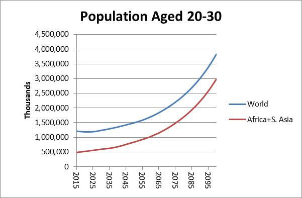 At constant fertility, the number of people aged 20 to 30 years will grow from 1.2 billion to almost 4 billion over the present century, and all of the growth will occur in Africa and South Asia (notably in Pakistan, where total fertility is 3.6 children per woman vs. 2.4 in India). Africa will be the main source of new young people.