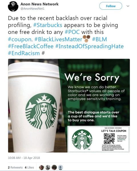 Game on for the meme warriors – mine is up above, but it wasn’t the best. No, the best was the wags who started creating realistic-looking coupons that entitled people of color to free coffee: