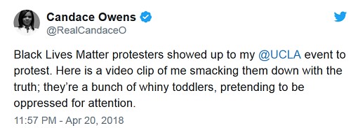 In a tweeted clip from the event, Owens referred to the protesters as “a bunch of whiny toddlers, pretending to be oppressed for attention.”