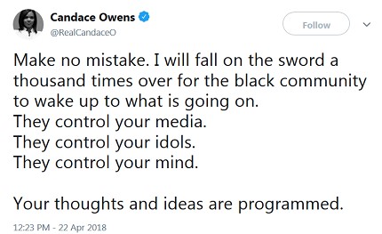 Kanye may already have begun that process, with his 22.5 million Twitter followers. The seven words he tweeted about Candace Owens boosted her profile immeasurably, but more importantly, they sparked a vital conversation the left does not want blacks to have.