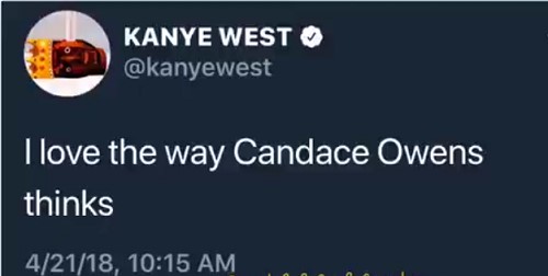 Then this past Saturday morning (4/21), Kanye dropped the bombshell tweet above, declaring, “I love the way Candace Owens thinks.”  Bear in mind, Kanye has 22.5 million Twitter followers.  Within hours, it was retweeted tens of thousands of and “liked” hundreds of thousands.