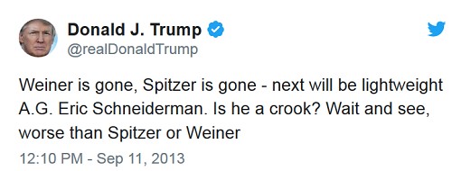 Donald  Trump clearly had a suspicion. In September 2013, Trump tweeted, “Weiner is gone, Spitzer is gone — next will be lightweight A.G. Eric Schneiderman. Is he a crook? Wait and see, worse than Spitzer or Weiner.” 2013 – almost five years ago!