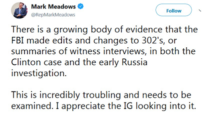 One fellow to help him do it is House Judiciary Member Mark Meadows (R-NC).  On Tuesday (6/19), he had the moxie to defy the demand of the FBI that “national security” required the impossibly biased yet unnamed FBI agents in the IG Report remain undisclosed.