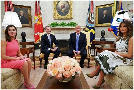 On Tuesday (6/19), the President and First Lady hosted the King and Queen of Spain at the White House.  Here’s a press pool photo of them in the Oval Office.
