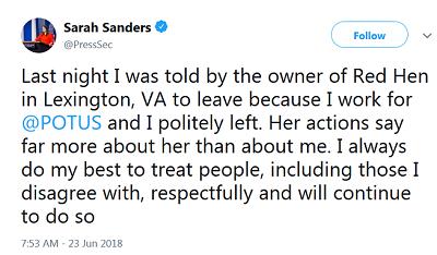 In response to the waiter’s gloating post on Facebook, Sarah Sanders tweeted:
