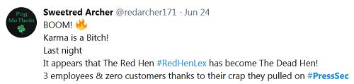 And now, because of the big meanie press secretary’s tweet, the Red Hen may be driven out of business. Boo hoo hoo. Soooo unfair!