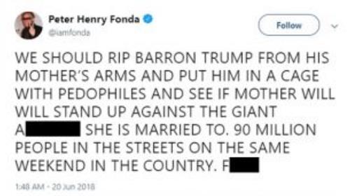 peter-henry-fonda-tweet-062018Does someone from the Trump family, the Trump Cabinet, or even the Trump administration have to be assaulted or worse, killed, before we accept the fact that a growing number from the far-left have put a rhetorical bounty on their heads?