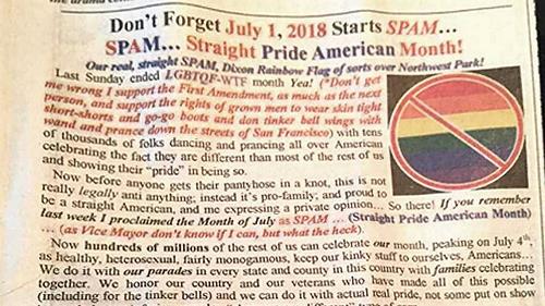 Okay, back to the USA.  And speaking of Pride events, let’s first head to Dixon, California where Vice-Mayor Ted Hickman has declared July to be Straight Pride American Month (SPAM):