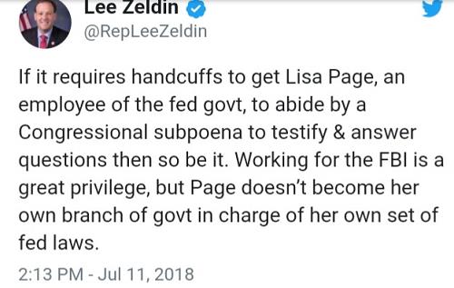 On Wednesday (7/11), Strzok’s partner in crime Lisa Page defied a Congressional subpoena to testify.  In response, GOP Rep.Lee Zeldin tweeted: