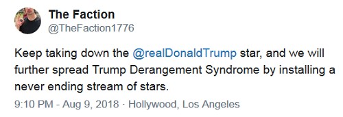 The idiots pick-axing Trump’s star on the Walk of Fame are the same as the Whining Acostas and High-Pitch Stelters of the fake media. They don’t understand that the Real Trump has infected America with winning fever, and like his star has infected the Walk of Fame — literally massing around and isolating cancerous stars like Blubbering Rob Reiner and Crying Jimmy Kimmel — the fever is spreading.