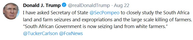 The Slimes’ bias is far more overt in another front page story this morning: Trump’s South Africa Tweet Seems to Embrace Racist Narrative on Land Dispute.  The POTUS tweet in question: