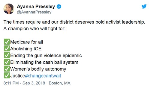 Last week (9/04), Ayanna Pressley defeated ten-term (since 1998) incumbent Congressman Michael Capuano to be the Dem candidate for Massachusetts 7th CD.  She was endorsed by the Boston Globe, former Mass Dem Party Chair John Walsh, current Mass Attorney General Maura Healey, and many other prominent Dems.  Here is what she stands for and expects to be elected for: