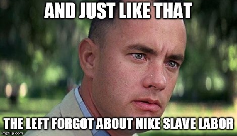From Honduras to Vietnam, Nike employs vast numbers of children at a few cents an hour to produce shoes the Left hated.  That hate is all over now.  After running its huge ad campaign praising a mediocre athlete for sacrificing nothing and for hating America instead, suddenly Nike is the darling of the Left.