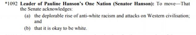 While yesterday (9/20), Senator Pauline Hanson from Queensland filed a motion in the Australian Senate condemning “anti-white racism” and affirming that “it’s okay to be white.”  Here is her motion published in the Parliamentary Record: