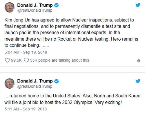 Even CNN heralded the 9/18-20 Kim-Moon summit: North and South Korea Commit to “An Era of No War.”  It really is an extraordinary moment, of which the President could take justifiable pride: