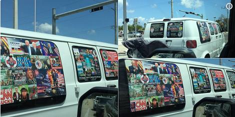 Previously, he had no history of being anywhere on the right, much less fanatically so.  Yet suddenly, his van is very professionally covered in Trump stickers and decals: