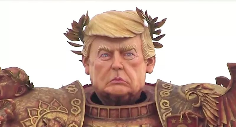 “The God Emperor Trump float emulates the dominant character of the war game Warhammer 40k, with the soundtrack of the Sabaton. Its gigantic dimensions and theme represent the ambition of the American president to relaunch the missions on the Moon and to create the first space army. The time of intellectuals, philosophers and of old and worn culture is over. The dominant male par-excellence has arrived, democratically, and is now here, among us.”