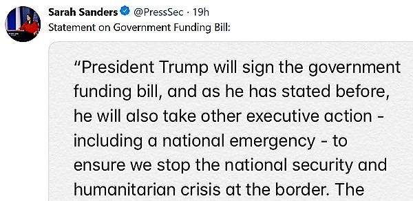 So much for that promise.  Despite this monstrosity of 1,159 pages which no one has read entire (just like last March) is one giant $333 billion poison pill preventing border security, Sarah Sanders quickly announced POTUS would break his promise and sign: