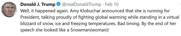 This is a real picture of Dem Sen. Amy Klobuchar (MN) announcing her running for president, not a joke photoshop.  POTUS couldn’t resist: