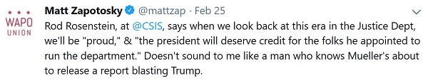 “If you are expecting Mueller/DOJ to willingly release a report that blasts Trump, or other unindicted people in his orbit, please read these remarks from Rod Rosenstein,” tweeted Washington Post reporter Matt Zapotosky.