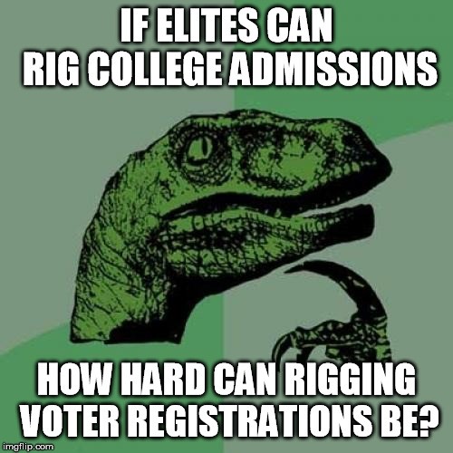 Illegal Alien Non-Citizen Vote Fraud, that’s what.  You’ve seen all the headline stories this week about rich celebs bribing elite colleges to get their 2-digit IQ kids accepted, right?  Well…